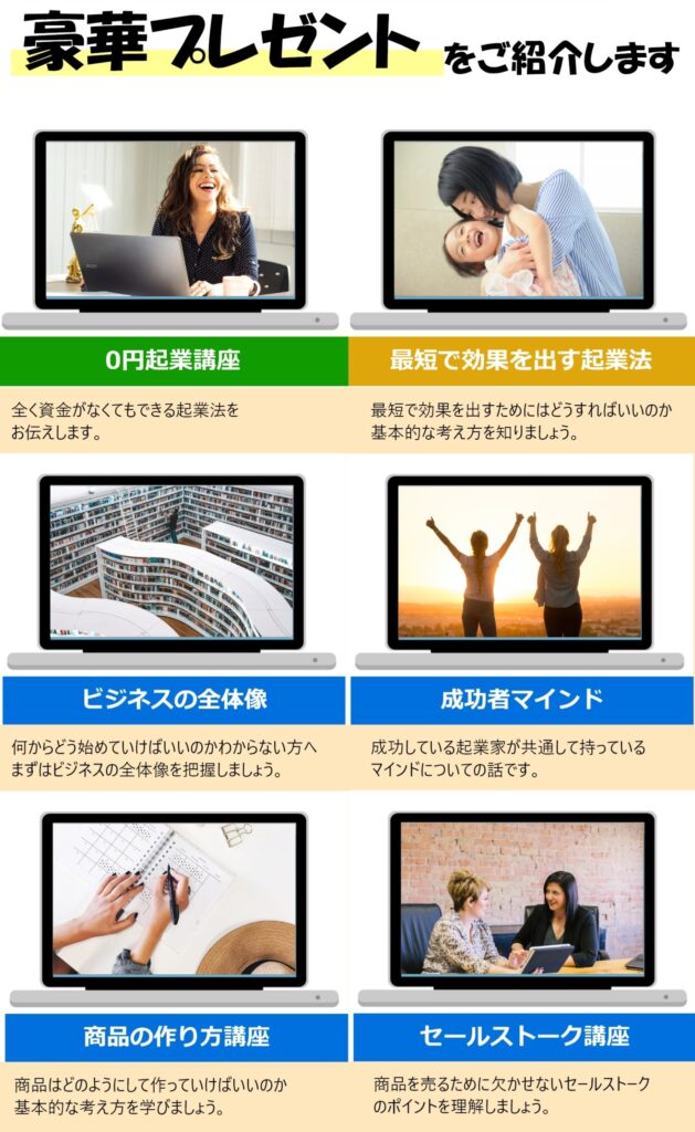 無料説明会に参加していただいた方に、以下の特典をお渡ししています。